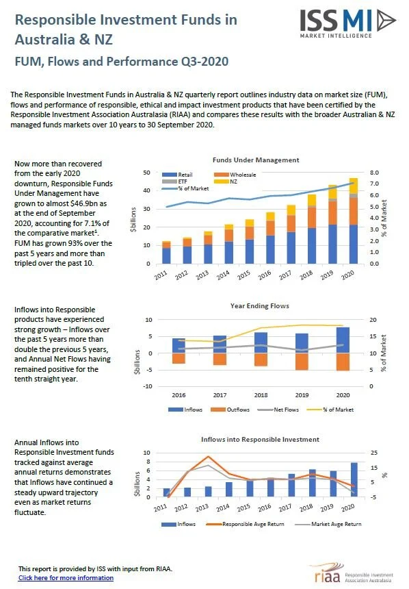 Market Overview (RIAA Certified) - Market Overview of Responsible Investment Funds in Australia & NZ (RIAA Certified) includes products that have been certified by the Responsible Investment Association Australasia (RIAA) and compares these results with the broader Australian & NZ managed funds markets over 10 years. View here.